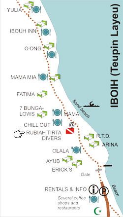 Perjalanan ke Iboih dari danau Aneuk Laot kurang lebih 1 1/2 jam, karena harus berhenti dibeberapa tempat. Sekitar pukul 11 saya sudah sampai di Iboih. Karena pertama kalinya kesini, saya sempat kelewat pintu masuk nya, akhirnya harus putar balik dan masuk ke lokasi wisata Teupin Layeu. Begitu masuk saya bingung mau kemana, tiba tiba ada abang abang nyamperin dan nawarin untuk snorkling ke pulau rubiah, karena kebetulan perahu masih ada bangku kosong, waktu itu saya ditawari dengan harga Rp 45.000, sudah lengkap tinggal nyebur aja. Tapi karena dipunggung masih menempel backpack, bingung juga mau nitip dimana, eh, malah ditawarin penginapan juga, tempatnya dipinggir jalan juga, dekat juga ke laut, per malam nya Rp 100.000. Tapi bukan tempat seperti itu yang ingin saya kunjungi atau tempat saya menginap. Berhubung motivasi saya ke Iboih ini karena postingannya Marischa Prudence, maka tempat yang seperti itu juga yang ingin saya tempati. Akhirnya nanya ke abang itu, kalau semacam bungalow di mana tempatnya, kata abangnya jauh diujung sana, dan biayanya bakal 2 kali lipat. Sempat menghubungi beberapa bungalow, seperti Iboih Inn dan Fatima bungalow, dan benar saja karena weekend kamar yang tersisa tinggal kamar yang harga mulai Rp 300.000. Tapi saya masih punya tempat tujuan menginap satu lagi yaitu Yulia Bungalow, beberapa kali saya hubungi tidak diangkat. Tapi saya bertekat gimanapun saya harus menginap di bungalow pinggir pantai dengan debur ombak dan bau laut yang menemani, sudah jauh jauh, jika pun harus mengeluarkan kocek lebih tak jadi soal. Motor saya parkir di ujung lokasi wisata, tapi pas mau ninggalin kok was was juga. Akhirnya nanya ke penjual es kelapa muda, kalau mau ke Yulia selain lewat sini bisa ga? kemudian dia kasih tahu bisa lewat atas, nanti setelah tikungan ada jalan masuk ke kanan nanjak, masuk aja, nanti motor bisa diparkir deket sana.
