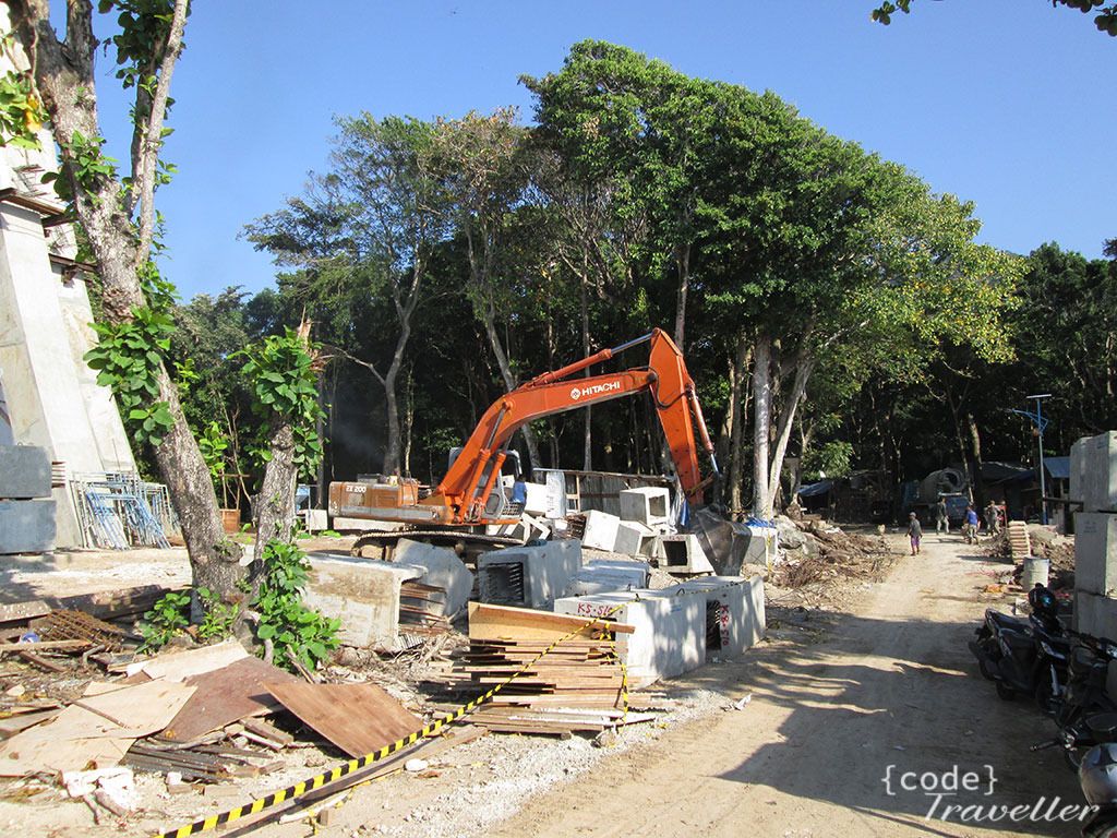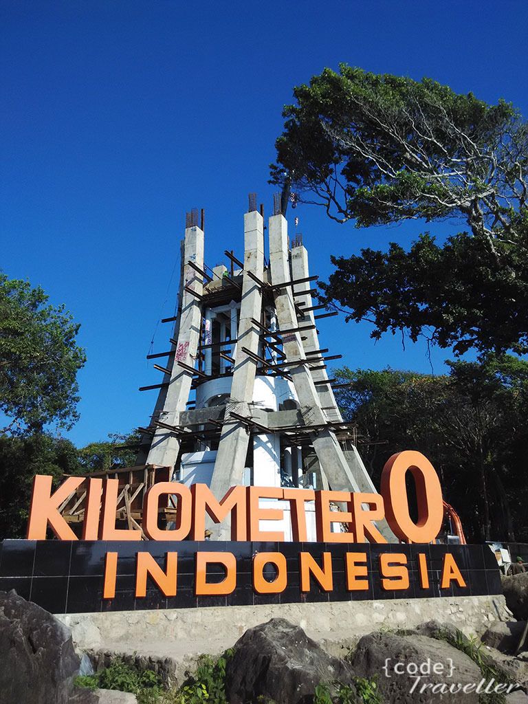 Sekitar pukul 16.00 saya menuju ke kilometer nol untuk menikmati sunset, saya lihat langit begitu cerah, sepanjang perjalanan hanya berharap diujung horison barat saya tidak menyempil awan yang bisa menghalangi sunset. Sekitar 15 menit berkendara dari Iboih, saya sudah sampai di pintu gerbang kilomter nol, saya pikir jaraknya jauh, ternyata cuma dekat kalau dari Iboih. Begitu masuk, disuruh lewat jalan keluar, karena sedang ada proyek. Perasaan udah ga enak, dan benar saja, tugu kilometer nol sedang dalam renovasi, kata penjual warung yang ada disitu seharusnya desember 2014 tahun kemarin dijadwalkan sudah selesai, tapi sampai sekarang belum kelar juga. Mau ga mau harus menikmati tugu kilometer nol diantara deru mesin alat berat, debu, dan tempat yang berantakan. Dipinggir tebing spot tempat menikmati sunset pun juga sudah berjajar pedagang kaki lima yang mengurangi keindahan, saya dan beberapa pengunjung kemudian harus menaiki pagar di belakang warung warung tersebur untuk bisa menikmati hamparan laut luas sembari menunggu senja datang. Meskipun harus dihadapkan dengan kondisi tugu yang belum rampung renovasi, tapi seenggaknya saya bisa menikmati perfect sunset, benar benar bisa menikmati secara utuh proses tenggelamnya matahari.