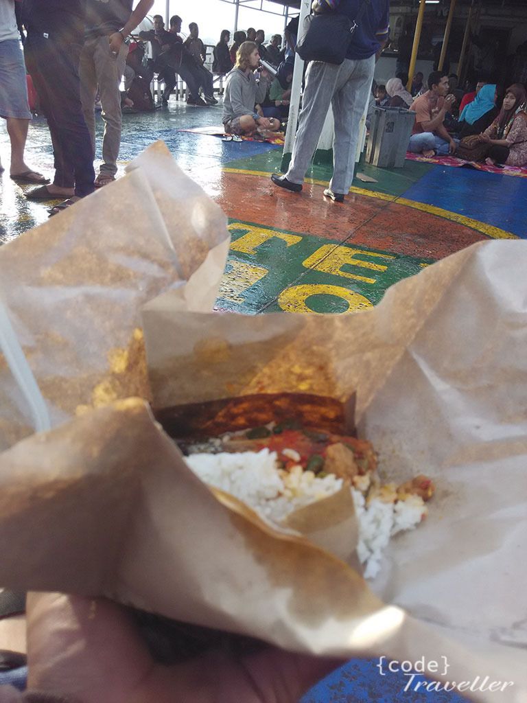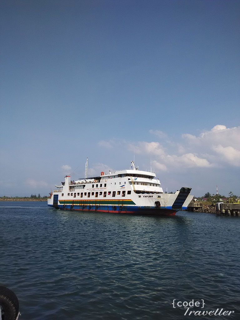 Tiket kapal saya beli dipintu masuk kapal, penumpang pagi itu begitu ramai, sampai saya sulit menemukan tempat duduk, bahkan lantai paling atas pun juga sudah penuh, akhirnya saya nemu bangku kosong, kosong karena bangkunya basah, jadi tidak ada yang memakai, karena di backpack ada bag cover nya, saya pakai itu untuk alas. Sambil menikmati sarapan nasi bungkus yang saya beli dari kantin kapal, saya menuju kembali ke pulau besar untuk melanjutkan penjelajahan di kota Banda Aceh.