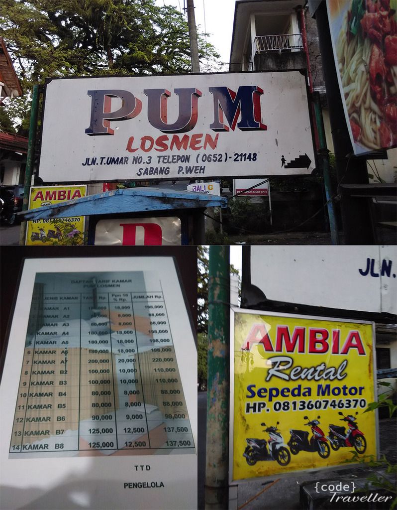 Malam itu saya putuskan untuk menginap di Losmen Pum, karena selain masih ada pilihan kamar, harga nya pun lebih murah dibanding dengan beberapa penginapan disekitar situ, sebenarnya kalau mau cari ada yang lebih murah, cuma harus masuk ke gang, saya sendiri sudah cukup capek dan ingin segera mandi dan merebahkan badan. Sebelum tidur, saya hubungi bang Ambia untuk hari minggu pagi sampai senin pagi saya mau pinjam motor, beruntung masih ada stok karena saya ngepasin weekend waktu berkunjung ke Weh. Biaya yang saya keluarkan Rp 150.000 untuk sewa motor honda beat, kondisi masih bagus.