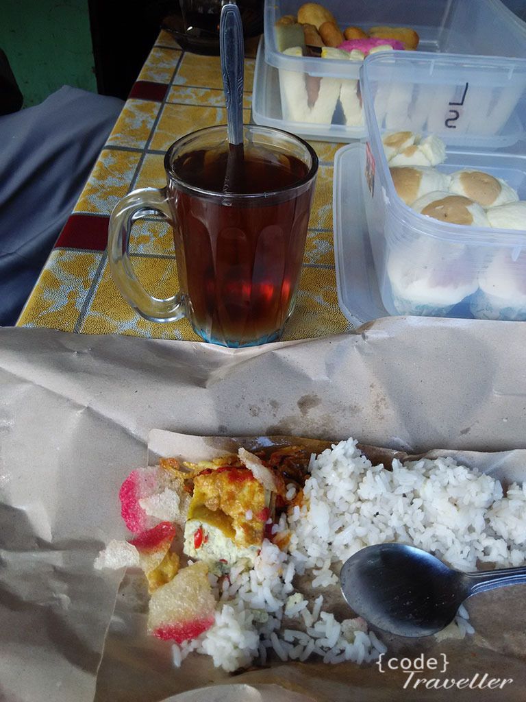 Minggu pagi saya segera mengemasi barang, dan checkout dari penginapan. Saya sudah janjian dengan bang Ambia sekitar pukul 07.00 motor saya ambil. Sembari menunggu motor, saya sarapan dulu nasi bungkus di Warung kopi depan losmen, 2 Bungkus Nasi Lauk Ikan, Teh Panas plus gorengan 2 cukup Rp 14.000 saja.