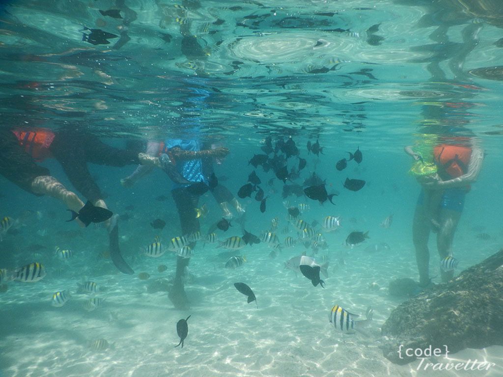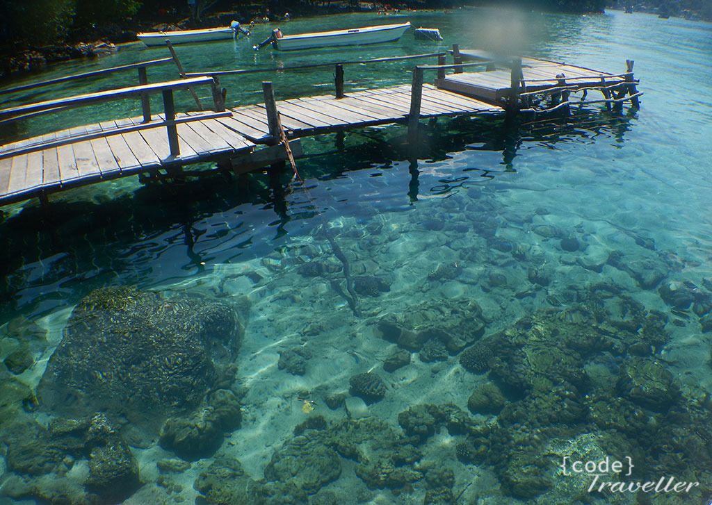 Setelah dirasa cukup, selain sudah capek fisik juga capek hati karena kehilangan memory card belum bisa dihapus dari ingatan. Sambil istrirahat, ngobrol dengan bapak bapak yang sedang memandu turis dari cina, dia ngomong, kalau jam jam segini ga bagus buat snorkling, kalau mau bagus pas pagi atau nanti sore mas, pas air laut surut, di tengah situ (sambil nunjuk ke kumpulan karang yang nampak membayang hitam) kalau pas air surut ikan ikan pada kumpul, dan kalau mau foto foto juga bagus. #jlebbb