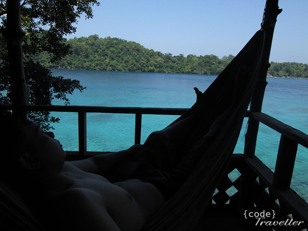 Saya selesaikan semua biaya sewa dan menyerahkan kamera untuk minta ditransferin foto hasil snorkling tadi. Kemudian saya mandi, dan istirahat di serambi bungalow, membaca buku sambil menikmati semilir angin sepoi sepoi diiringi deburan ombak, sungguh nikmat mana lagi yang bisa didustakan.