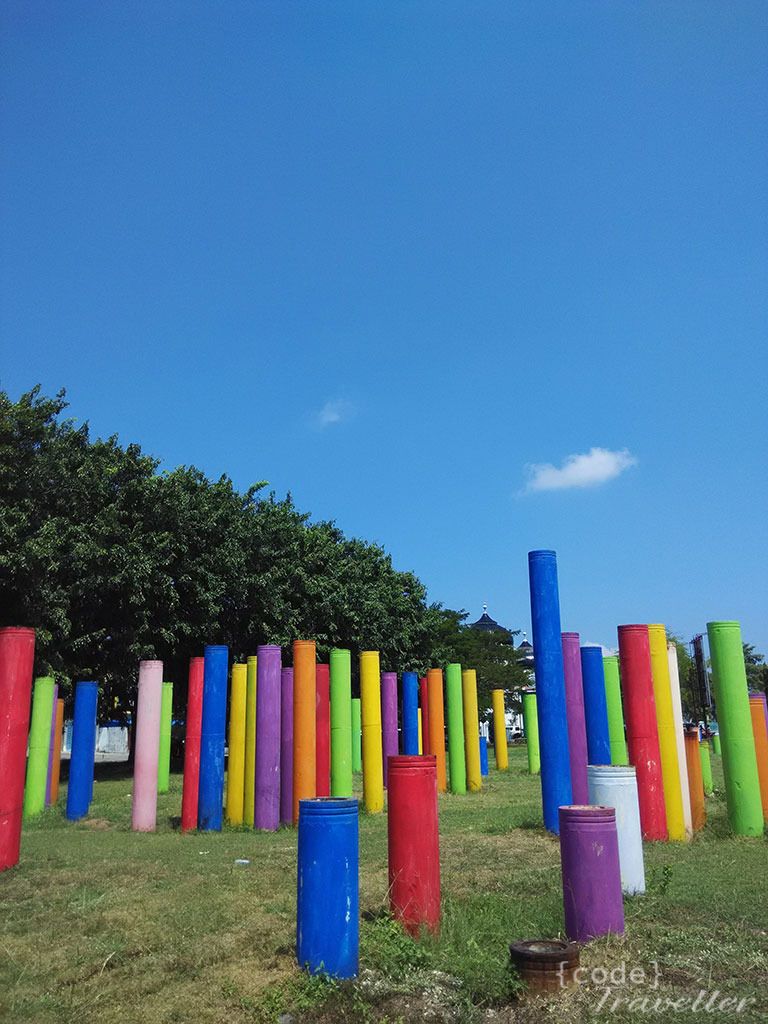 Di ujung taman, yang berada dekat dengan masjid Baiturrahman ini ada pancang pancang paku bumi yang ditancapkan secara random dan dicat dengan berbagai warna, saya ga tahu apa maksudnya, karena di situ tidak ada monumen yang menjelaskan kenapa ada tiang pancang semacam itu.