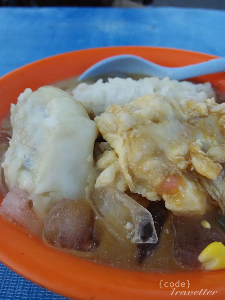 Bingung juga awalnya mau makan apa, tapi kemudian saya memilih untuk sarapan dengan Lontong Sayur Medan. Saya cukup mengeluarkan Rp 15.000 untuk satu porsi Lontong Sayur + Teh Panas + 1 Bungkus kerupuk udang.