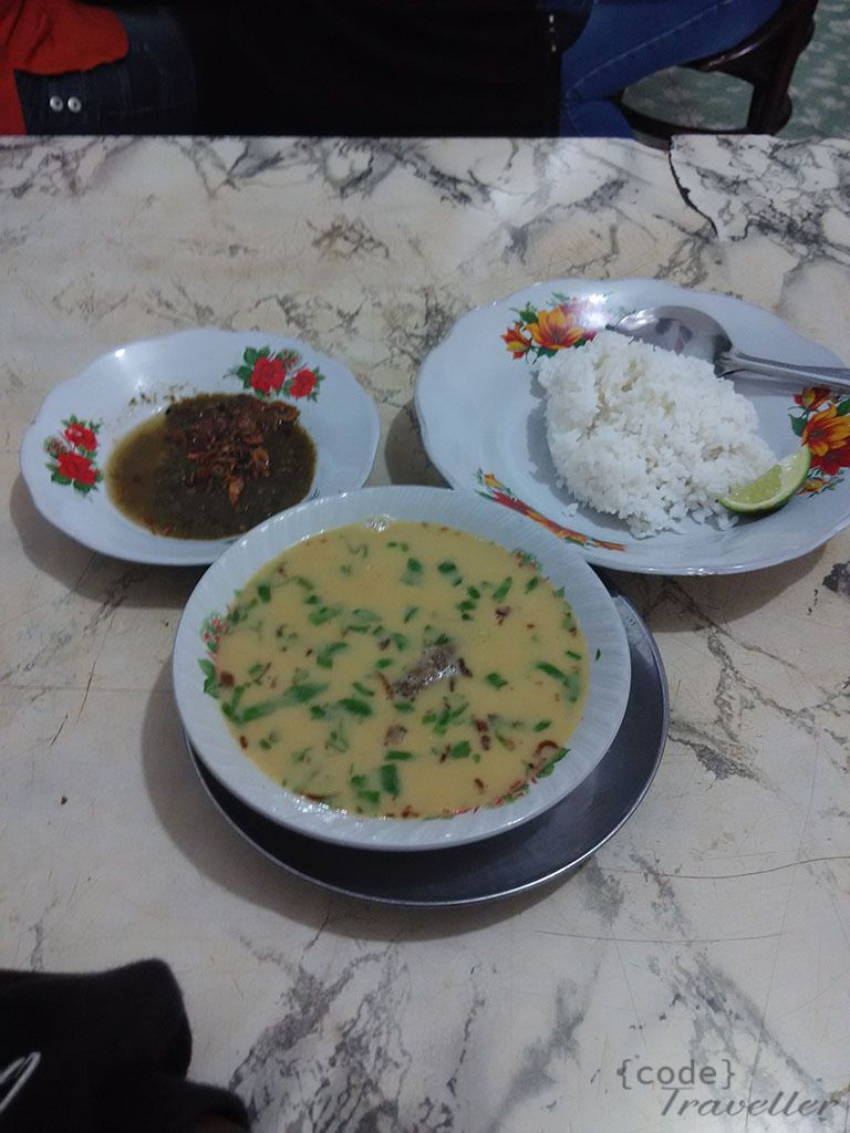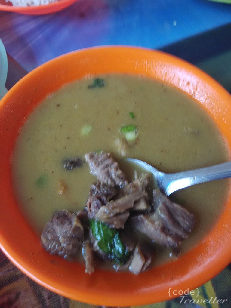 Ga ada kewajiban untuk mengahabiskan menu yang tersaji, dan ga aturan makan ga dimakan bayarnya sama. Tapi emang lapar, ludes semua tuh semua makanan yang disajikan. Lalu apa yang istimewa dari soto ini, menurut saya yang istimewa adalah sambal nya, penasaran cara bikinnya, ini semacam sambal yang kemudian disiram kecap, tapi bukan sambal kecap pada umumnya, kalau dari rasa sih sepertinya sambal nya ketika di uleg dicampur juga dengan bawang merah goreng, bukan ditaburin, tapi diuleg bareng. Meskipun toping nya juga ditaburin dengan bawang merah goreng juga sih. Oh iya, rempeyek udang nya juga enak, klo saya mah, apapun itu asal udang ya jadinya istimewa. Kalau dari sotonya sih ga begitu istimewa, karena soto dengan kuah santan seperti ini mirip mirip dengan soto bogor dan soto betawi yang sebelumnya saya pernah makan.